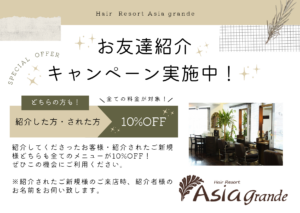 当店を利用したことのある方で、ご友人やご家族などまだ当店を利用したことの無い方にご紹介していただき、実際に紹介された方がご来店されますと【紹介した人・紹介された人】どちらもお会計から10%OFFが適用されます♪