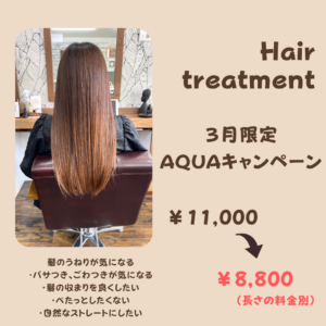こんにちは!! 3月AQUA treatmentのキャンペーンをして開催しております。
